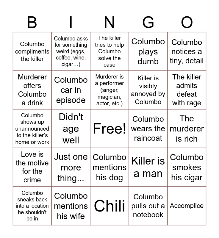 This bingo card has a free space and 24 words: Just one more thing..., Columbo mentions his wife, Murderer is a performer (singer, magician, actor, etc.), Columbo sneaks back into a location he shouldn't be in, Columbo notices a tiny, detail, Columbo compliments the killer, Murderer offers Columbo a drink, Columbo asks for something weird (eggs, coffee, wine, cigar…), Columbo wears the raincoat, Columbo mentions his dog, Killer is visibly annoyed by Columbo, Columbo shows up unannounced to the killer’s home or work, Killer is a man, Columbo smokes his cigar, Columbo car in episode, Columbo pulls out a notebook, The murderer is rich, The killer tries to help Columbo solve the case, The killer admits defeat with rage, Didn't age well, Accomplice, Love is the motive for the crime, Columbo plays dumb and Chili.