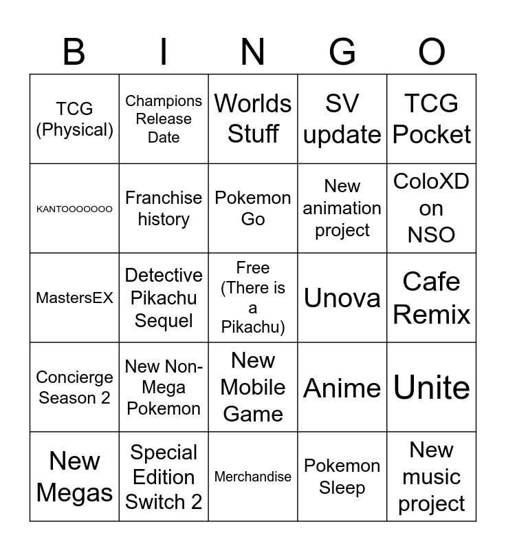 This bingo card has a free space and 24 words: New Megas, New Non-Mega Pokemon, Pokemon Go, Pokemon Sleep, TCG Pocket, TCG (Physical), Champions Release Date, Worlds Stuff, Unova, Cafe Remix, MastersEX, Franchise history, Anime, Unite, KANTOOOOOOO, Special Edition Switch 2, Merchandise, SV update, ColoXD on NSO, Concierge Season 2, Detective Pikachu Sequel, New Mobile Game, New animation project and New music project.