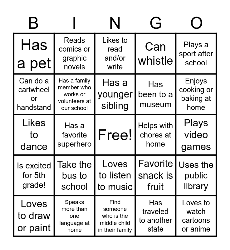 This bingo card has a free space and 24 words: Take the bus to school, Speaks more than one language at home, Has a younger sibling, Loves to draw or paint, Plays a sport after school, Has a pet, Can do a cartwheel or handstand, Reads comics or graphic novels, Helps with chores at home, Loves to listen to music, Has been to a museum, Likes to dance, Favorite snack is fruit, Uses the public library, Has a family member who works or volunteers at our school, Has traveled to another state, Plays video games, Likes to read and/or write, Enjoys cooking or baking at home, Has a favorite superhero, Loves to watch cartoons or anime, Is excited for 5th grade!, Can whistle and Find someone who is the middle child in their family.