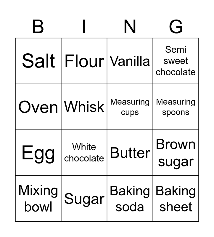 This bingo card has 16 words: Sugar, Brown sugar, Vanilla, Salt, Egg, Flour, Butter, Baking soda, Oven, Whisk, Mixing bowl, Semi sweet chocolate, White chocolate, Measuring spoons, Measuring cups and Baking sheet.