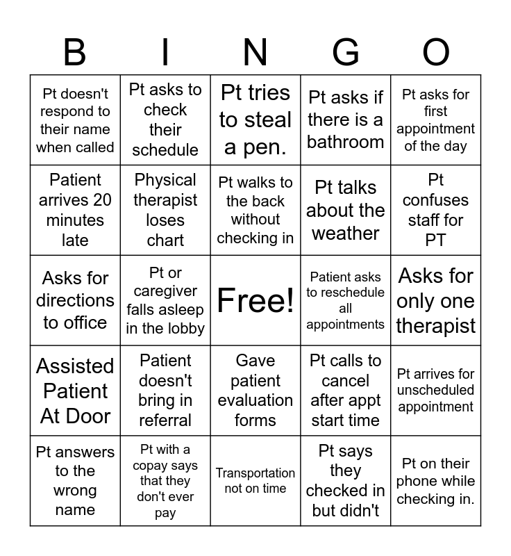 This bingo card has a free space and 24 words: Patient doesn't bring in referral, Pt with a copay says that they don't ever pay, Pt walks to the back without checking in, Pt answers to the wrong name, Pt asks for first appointment of the day, Pt doesn't respond to their name when called, Patient arrives 20 minutes late, Pt asks to check their schedule, Patient asks to reschedule all appointments, Gave patient evaluation forms, Pt talks about the weather, Asks for directions to office, Pt calls to cancel after appt start time, Pt arrives for unscheduled appointment, Physical therapist loses chart, Pt says they checked in but didn't, Asks for only one therapist, Pt tries to steal a pen., Pt confuses staff for PT, Pt or caregiver falls asleep in the lobby, Pt on their phone while checking in., Assisted Patient At Door, Pt asks if there is a bathroom and Transportation not on time.