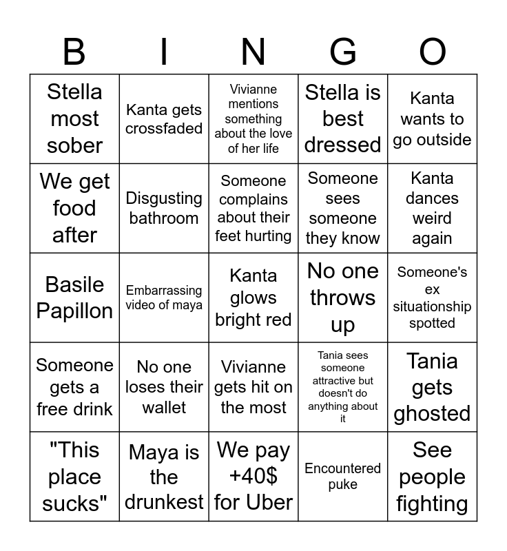 This bingo card has a free space and 24 words: No one loses their wallet, Maya is the drunkest, Someone complains about their feet hurting, "This place sucks", Kanta wants to go outside, Stella most sober, We get food after, Kanta gets crossfaded, No one throws up, Vivianne gets hit on the most, Someone sees someone they know, Basile Papillon, Tania sees someone attractive but doesn't do anything about it, Tania gets ghosted, Disgusting bathroom, Encountered puke, Someone's ex situationship spotted, Vivianne mentions something about the love of her life, Kanta dances weird again, Embarrassing video of maya, See people fighting, Someone gets a free drink, Stella is best dressed and We pay +40$ for Uber.