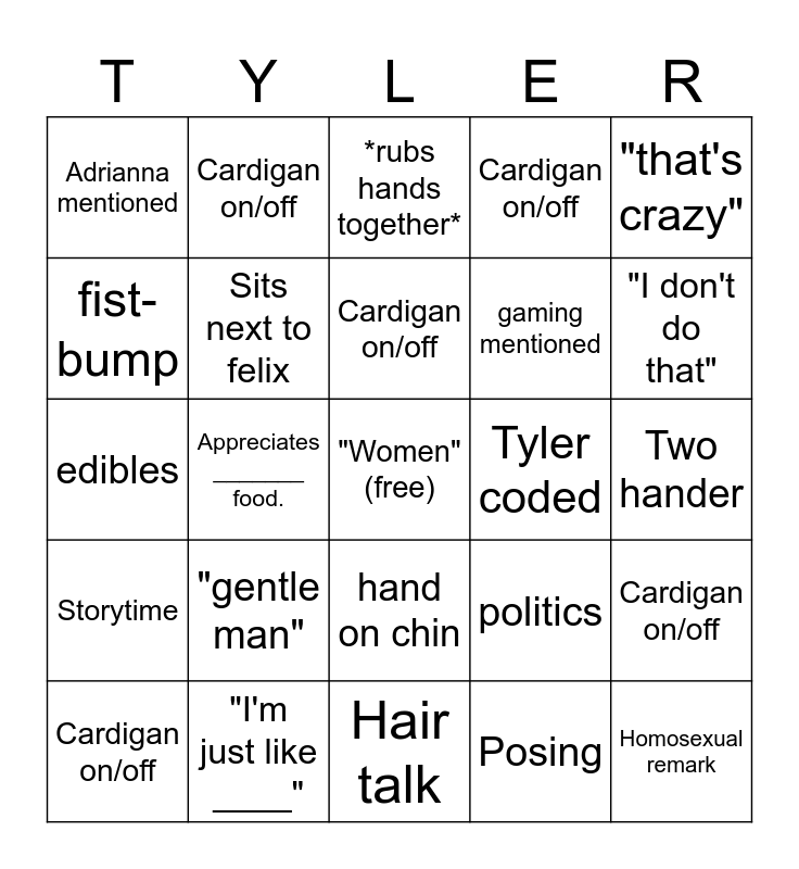 This bingo card has a free space and 29 words: Cardigan on/off, "I love women", Appreciates _______ food., Puts up hair, Adrianna mentioned, *rubs hands together*, Sits next to felix, "gentle man", Tyler coded, "I'm just like ____", Two hander, Homosexual remark, Hair talk, Posing, "I don't do that", 😏, hand on chin, Storytime, "that's crazy", edibles, politics, hair touching/ flipping, gaming mentioned, fist-bump, Cardigan on/off, Cardigan on/off, Cardigan on/off, Cardigan on/off and Cardigan on/off.