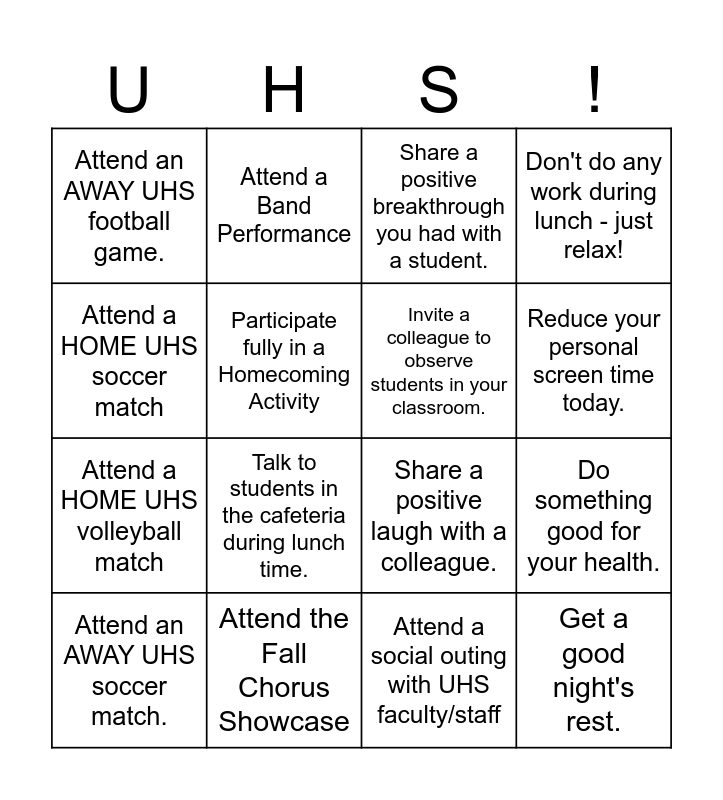 This bingo card has 28 words: Attend a HOME UHS football game, Attend the Fall Play, Attend a social outing with UHS faculty/staff, Walk with a colleague during your prep or lunch time, Attend a HOME UHS soccer match, Attend a Band Performance, Share a positive breakthrough you had with a student., Do something good for your health., Attend a HOME UHS volleyball match, Attend the Fall Chorus Showcase, Bring a treat to share with colleagues, Don't do any work during lunch - just relax!, Attend a UHS XC meet, Send a positive note home for a student, Observe students in another teacher's class., Go home right after school & do NOT work on anything for school., Attend an AWAY UHS volleyball game, Participate fully in a Homecoming Activity, Share a positive laugh with a colleague., Get a good night's rest., Attend an AWAY UHS football game., Talk to students in the cafeteria before school., Give a genuine compliment to a colleague today., Reduce your personal screen time today., Attend an AWAY UHS soccer match., Talk to students in the cafeteria during lunch time., Invite a colleague to observe students in your classroom. and Take time to meditate or notice positive things around you..