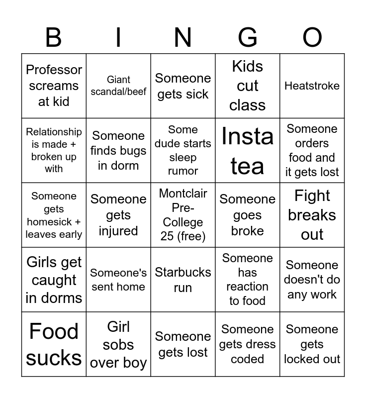 This bingo card has a free space and 24 words: Someone's sent home, Girl sobs over boy, Some dude starts sleep rumor, Food sucks, Heatstroke, Professor screams at kid, Relationship is made + broken up with, Giant scandal/beef, Someone goes broke, Starbucks run, Insta tea, Someone gets homesick + leaves early, Someone has reaction to food, Someone doesn't do any work, Someone finds bugs in dorm, Someone gets dress coded, Fight breaks out, Someone gets sick, Someone orders food and it gets lost, Someone gets injured, Someone gets locked out, Girls get caught in dorms, Kids cut class and Someone gets lost.