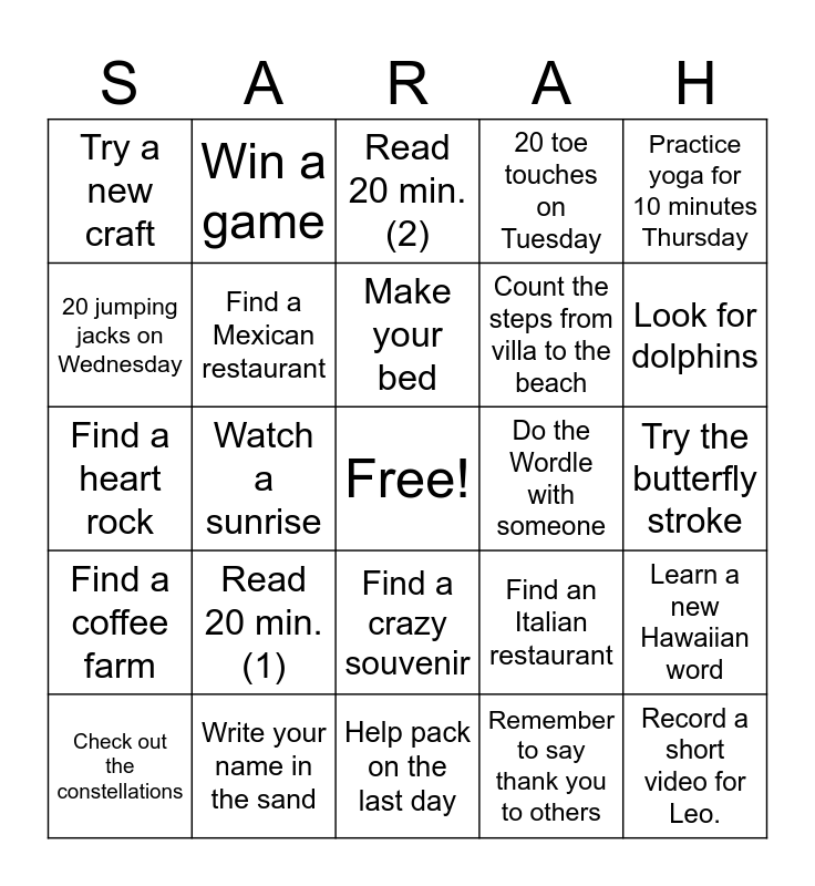 This bingo card has a free space and 24 words: Read 20 min. (1), Write your name in the sand, Make your bed, Check out the constellations, Practice yoga for 10 minutes Thursday, Try a new craft, 20 jumping jacks on Wednesday, Win a game, Do the Wordle with someone, Find a crazy souvenir, Count the steps from villa to the beach, Find a heart rock, Find an Italian restaurant, Learn a new Hawaiian word, Find a Mexican restaurant, Remember to say thank you to others, Try the butterfly stroke, Read 20 min.(2), Look for dolphins, Watch a sunrise, Record a short video for Leo., Find a coffee farm, 20 toe touches on Tuesday and Help pack on the last day.