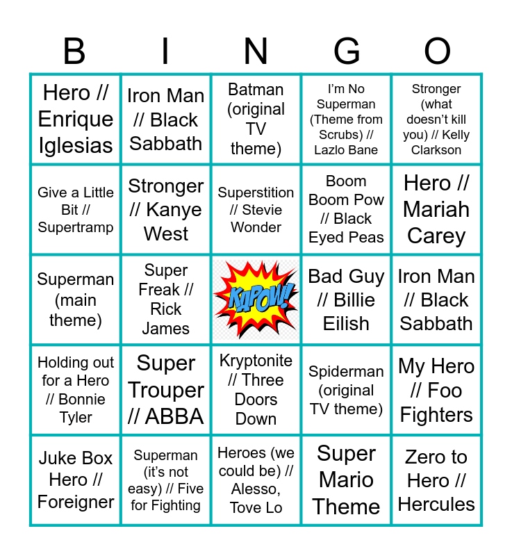 This bingo card has a free space and 31 words: Heroes (we could be) // Alesso, Tove Lo, Champagne Supernova // Oasis, Super Freak // Rick James, Help! // The Beatles, Hero // Enrique Iglesias, Batman (original TV theme), Stronger // Kanye West, Spiderman (original TV theme), Bad Guy // Billie Eilish, Super Mario Theme, Iron Man // Black Sabbath, Zero to Hero // Hercules, Super Bass // Nicki Minaj, Rescue Me // Fontella Bass, Hero // Mariah Carey, We Don’t Need Another Hero // Tina Turner, My Hero // Foo Fighters, Super Trouper // ABBA, Holding out for a Hero // Bonnie Tyler, Kryptonite // Three Doors Down, Stronger (what doesn’t kill you) // Kelly Clarkson, Hero // Chad Kroeger, Juke Box Hero // Foreigner, Iron Man // Black Sabbath, Boom Boom Pow // Black Eyed Peas, Give a Little Bit // Supertramp, I’m No Superman (Theme from Scrubs) // Lazlo Bane, Superman (main theme), Superman (it’s not easy) // Five for Fighting, Superstition // Stevie Wonder and Fighter // Christina Aguilera.