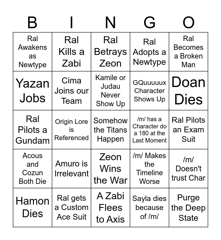 This bingo card has 25 words: Amuro is Irrelevant, A Zabi Flees to Axis, Kamile or Judau Never Show Up, Hamon Dies, Ral Becomes a Broken Man, Ral Awakens as Newtype, Yazan Jobs, Ral Kills a Zabi, /m/ has a Character do a 180 at the Last Moment, Zeon Wins the War, GQuuuuux Character Shows Up, Ral Pilots a Gundam, /m/ Makes the Timeline Worse, /m/ Doesn't trust Char, Cima Joins our Team, Purge the Deep State, Ral Pilots an Exam Suit, Ral Betrays Zeon, Doan Dies, Origin Lore is Referenced, Somehow the Titans Happen, Ral gets a Custom Ace Suit, Acous and Cozun Both Die, Ral Adopts a Newtype and Sayla dies because of /m/.