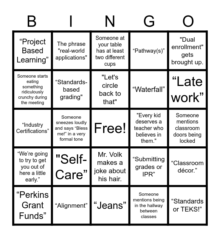 This bingo card has a free space and 75 words: Someone mentions how tired they are, “I’m not ready to come back yet”, Someone at your table has at least two different cups, Someone comes in late, Someone checks their phone under the table, Someone checks their phone in plain sight, Someone is on a laptop doing something which doesn’t pertain to this meeting, Someone talks about the weather, “Celebrations?”, "Let's circle back", Someone apologizes for being late or distracted, A slide with at least 30 words on it, "Let's circle back to that", Someone starts eating something ridiculously crunchy during the meeting, “Sorry, I just have a quick question”... then proceeds to ask a long-winded question, Someone sneezes loudly and says “Bless me!” in a very formal tone, "Cross-curricular", “Standards or TEKS!”, “Soft Skills or Employability”, "Dual enrollment" gets brought up., “Home Campus”, “Industry Certifications”, “Standards-based grading", The phrase "real-world applications", “Pathway(s)”, “Career readiness”, "furniture or desks or chairs", “Contract Hours”, “Door Duty”, Tardies”, “Mailbox”, “Number of grades in marking period”, “feedback on student work.”, “Submitting grades or IPR”, “Late work”, “Waterfall”, “Rubric”, “Safety Drills”, Someone mentions classroom doors being locked, Someone mentions being in the hallway between classes, “Taking attendance”, “Student Handbook or Addendum?”, Someone mentions printers or print shop, Someone mentions office supplies of any kind, “Hands-On Learning”, “Real-World”, “Perkins Grant Funds”, “Project Based Learning”, “Professionalism or Employability Skills”, New teachers get introduced to the group, “Open House or Meet the Teacher Night”, Mr. Volk makes a joke about his hair., We hear from our counselor, Miss Yeates, We hear from the special ed department, Introduce yourself to a new hire, The admin team reminds us of the dress code for staff., We hear from the new DLC, Miss Matos, Mr. Volk offers up a terrible [amazing] pun., “Exchange Days”, "Remember your why.", "Self-Care”, “Relationships”, “It’s about progress, not perfection.”, “Culture”, “Collaboration", "Every kid deserves a teacher who believes in them.", “Scaffolding”, “Engage”, “Strategies", “Classroom décor.”, “We’re going to try to get you out of here a little early.”, “Alignment”, “Goals”, “Jeans” and Someone takes a picture of the slides even thought it’ll be emailed out later..