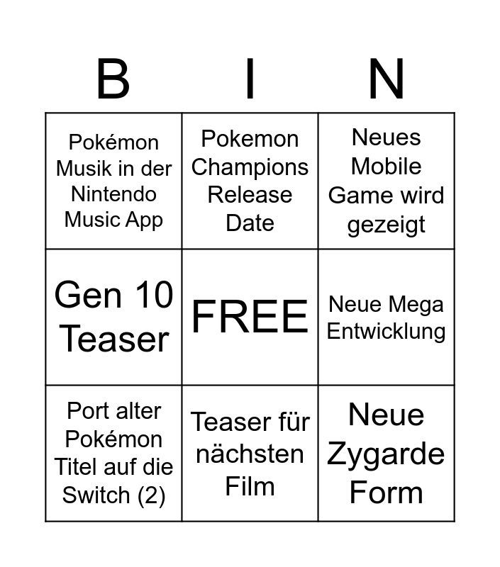 This bingo card has a free space and 8 words: Neue Mega Entwicklung, Neues Mobile Game wird gezeigt, Pokemon Champions Release Date, Port alter Pokémon Titel auf die Switch (2), Pokémon Musik in der Nintendo Music App, Neue Zygarde Form, Gen 10 Teaser and Teaser für nächsten Film.