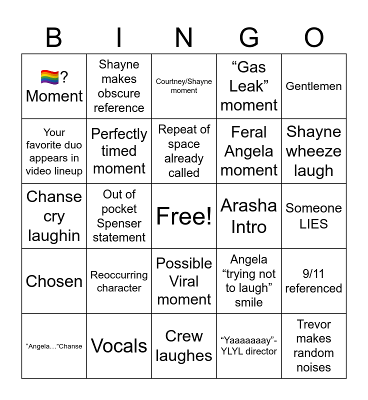 This bingo card has a free space and 29 words: “Angela…”Chanse, Cast member tells personal story, Out of pocket Spenser statement, Amanda doesn’t know reference, 🏳️🌈? Moment, Courtney/Shayne moment, Perfectly timed moment, Reoccurring character, Arasha Intro, Vocals, Someone LIES, Trevor makes random noises, Crew laughes, “Yaaaaaaay”-YLYL director, Shayne wheeze laugh, Straight Chanse, Possible Viral moment, Chosen, Gentlemen, Chanse cry laughin, Angela “trying not to laugh” smile, Vine reference, Feral Angela moment, Your favorite duo appears in video lineup, “Gas Leak” moment, Shayne makes obscure reference, 9/11 referenced, Repeat of space already called and Outlandish statement by anyone.
