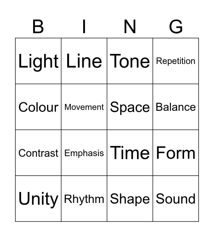 This bingo card has 19 words: Time, Texture, Tone, Sound, Form, Colour, Shape, Light, Line, Contrast, Emphasis, Movement, Space, Rhythm, Unity, Variety, Repetition, Balance and Scale.