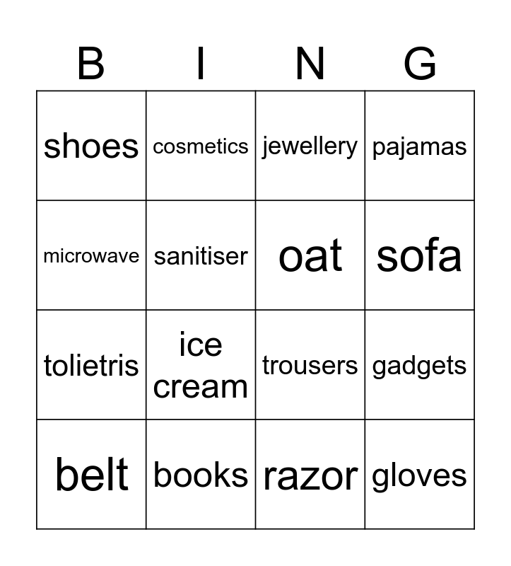 This bingo card has 16 words: books, gadgets, jewellery, shoes, tolietris, cosmetics, trousers, razor, microwave, sanitiser, belt, pajamas, ice cream, sofa, oat and gloves.