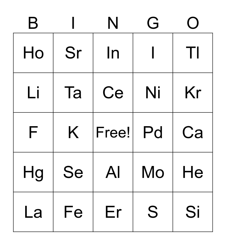 This bingo card has a free space and 90 words: Ac, Ag, Al, Ar, As, At, Au, B, Ba, Be, Bi, Br, C, Ca, Cd, Ce, Cl, Co, Cr, Cs, Cu, Dy, Er, Eu, F, Fe, Fr, Ga, Gd, Ge, H, He, Hf, Hg, Ho, I, In, Ir, K, Kr, La, Li, Lu, Mg, Mn, Mo, N, Na, Nb, Nd, Ne, Ni, O, Os, P, Pb, Pd, Pm, Po, Pr, Pt, Ra, Rb, Re, Rh, Rn, Ru, S, Sb, Sc, Se, Si, Sm, Sn, Sr, Ta, Tb, Tc, Te, Th, Ti, Tl, Tm, V, W, Xe, Y, Yb, Zn and Zr.