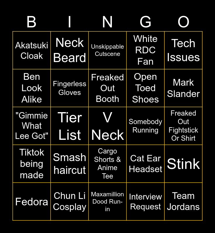 This bingo card has a free space and 24 words: Smash haircut, Chun Li Cosplay, Freaked Out Booth, Fedora, Tech Issues, Akatsuki Cloak, Ben Look Alike, Neck Beard, Somebody Running, Cargo Shorts & Anime Tee, Open Toed Shoes, "Gimmie What Lee Got", Cat Ear Headset, Stink, Fingerless Gloves, Interview Request, Freaked Out Fightstick Or Shirt, Unskippable Cutscene, Mark Slander, Tier List, Team Jordans, Tiktok being made, White RDC Fan and Maxamillion Dood Run-in.