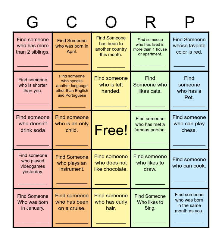This bingo card has a free space and 25 words: Find Someone Who was born in January. ____________, Find Someone who plays an instrument. ___________, Find someone who is left handed. ___________, Find Someone Who likes to Sing. ____________, Find someone who has a Pet. ___________, Find someone who has more than 2 siblings. ___________, Find Someone who was born in April. _____________, Find Someone has been to another country this month. ___________, Find Someone who likes cats. __________, Find someone who can cook. ___________, Find someone who doesn't drink soda ___________, Find someone who speaks another language other than English and Portuguese ____________, Find someone who likes to draw. __________, Find someone who was born in the same month as you. ___________, Find someone who is shorter than you. _____________, Find someone who has been on a cruise. ___________, Find someone who has curly hair. __________, Find someone who has lived in more than 1 house or apartment. ______________, Find someone who can play chess. ___________, Find someone who played videogames yesterday. ___________, Find someone who is an only child. ___________, Find someone who does not like chocolate. ___________, Find someone who has met a famous person. _____________, Find Someone whose favorite color is red. ___________ and Find someone who is wearing a blue shirt. ____________.