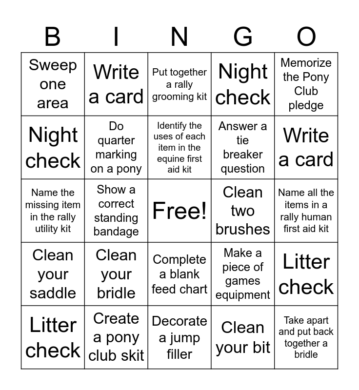 This bingo card has a free space and 24 words: Clean your bridle, Create a pony club skit, Identify the uses of each item in the equine first aid kit, Litter check, Memorize the Pony Club pledge, Sweep one area, Night check, Write a card, Clean two brushes, Complete a blank feed chart, Answer a tie breaker question, Name the missing item in the rally utility kit, Make a piece of games equipment, Litter check, Do quarter marking on a pony, Clean your bit, Name all the items in a rally human first aid kit, Put together a rally grooming kit, Write a card, Show a correct standing bandage, Take apart and put back together a bridle, Clean your saddle, Night check and Decorate a jump filler.