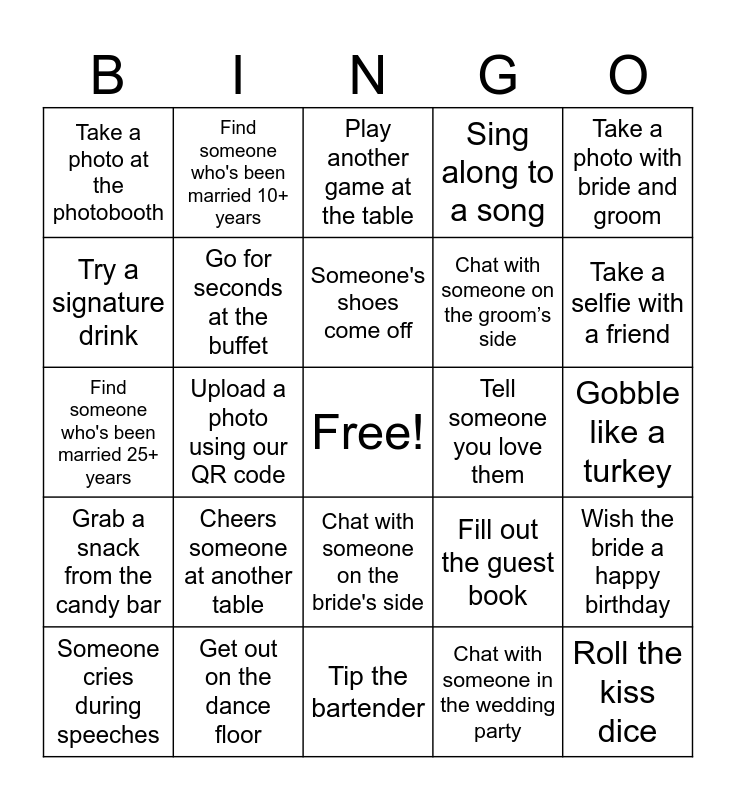 This bingo card has a free space and 24 words: Cheers someone at another table, Get out on the dance floor, Someone's shoes come off, Someone cries during speeches, Take a photo with bride and groom, Take a photo at the photobooth, Try a signature drink, Find someone who's been married 10+ years, Tell someone you love them, Chat with someone on the bride's side, Chat with someone on the groom’s side, Find someone who's been married 25+ years, Fill out the guest book, Wish the bride a happy birthday, Go for seconds at the buffet, Chat with someone in the wedding party, Gobble like a turkey, Play another game at the table, Take a selfie with a friend, Upload a photo using our QR code, Roll the kiss dice, Grab a snack from the candy bar, Sing along to a song and Tip the bartender.