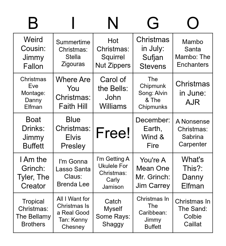 This bingo card has a free space and 45 words: Mele Kalikimaka: Hawaiian Waikiki Beach Entertainers, Christmas In The Sand: Colbie Caillat, Christmas Island: Ella Fitzgerald, Tropical Christmas: The Bellamy Brothers, Little Saint Nick: The Beach Boys, Christmas In The Caribbean: Jimmy Buffett, Hot Christmas: Squirrel Nut Zippers, Surfin' Santa: Lord Douglas Byron, Mambo Santa Mambo: The Enchanters, All I Want for Christmas Is a Real Good Tan: Kenny Chesney, Christmas in July: Sufjan Stevens, December: Earth, Wind & Fire, I'm Getting A Ukulele For Christmas: Carly Jamison, I'm Gonna Lasso Santa Claus: Brenda Lee, No Icy Christmas: Shaggy, Catch Myself Some Rays: Shaggy, Guitars And Tiki Bars: Kenny Chesney, Boat Drinks: Jimmy Buffett, Ho Ho Ho And A Bottle Of Rum: Jimmy Buffett, Christmas in June: AJR, Summertime Christmas: Stella Zigouras, HOLIDAY: Lil Nas X, Wet, Wet Christmas: SpongeBob, Weird Cousin: Jimmy Fallon, All I Want for Christmas Is You: Mariah Carey, A Nonsense Christmas: Sabrina Carpenter, DJ Play A Christmas Song: Cher, Drummer Boy: Justin Bieber, You're A Mean One Mr. Grinch: Jim Carrey, I Am the Grinch: Tyler, The Creator, Christmas Is: Run - DMC, What's This?: Danny Elfman, Jingle Bass: ARIUS, Last Christmas: Wham!, Silver Bells: Dean Martin, Blue Christmas: Elvis Presley, I'll Be Home For Christmas: Max McNown, Merry Christmas: Ed Sheeran, Christmas In Hollis: Run - DMC, Carol of the Bells: John Williams, Christmas Eve Montage: Danny Elfman, The Chipmunk Song: Alvin & The Chipmunks, Santa Clause Is Coming To Town: The Jackson 5, Where Are You Christmas: Faith Hill and Puppies Are Forever: Sia.
