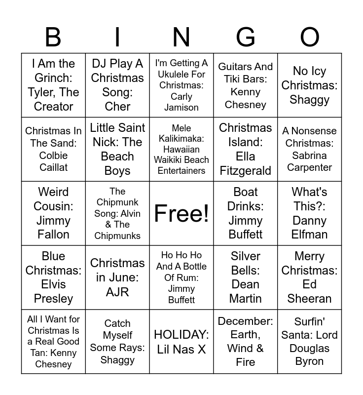This bingo card has a free space and 45 words: Hot Christmas: Squirrel Nut Zippers, Surfin' Santa: Lord Douglas Byron, Mambo Santa Mambo: The Enchanters, All I Want for Christmas Is a Real Good Tan: Kenny Chesney, Christmas in July: Sufjan Stevens, December: Earth, Wind & Fire, I'm Getting A Ukulele For Christmas: Carly Jamison, I'm Gonna Lasso Santa Claus: Brenda Lee, No Icy Christmas: Shaggy, Catch Myself Some Rays: Shaggy, Guitars And Tiki Bars: Kenny Chesney, Boat Drinks: Jimmy Buffett, Ho Ho Ho And A Bottle Of Rum: Jimmy Buffett, Christmas in June: AJR, Summertime Christmas: Stella Zigouras, HOLIDAY: Lil Nas X, Wet, Wet Christmas: SpongeBob, Weird Cousin: Jimmy Fallon, All I Want for Christmas Is You: Mariah Carey, A Nonsense Christmas: Sabrina Carpenter, DJ Play A Christmas Song: Cher, Drummer Boy: Justin Bieber, You're A Mean One Mr. Grinch: Jim Carrey, I Am the Grinch: Tyler, The Creator, Christmas Is: Run - DMC, What's This?: Danny Elfman, Jingle Bass: ARIUS, Last Christmas: Wham!, Silver Bells: Dean Martin, Blue Christmas: Elvis Presley, I'll Be Home For Christmas: Max McNown, Merry Christmas: Ed Sheeran, Christmas In Hollis: Run - DMC, Carol of the Bells: John Williams, Christmas Eve Montage: Danny Elfman, The Chipmunk Song: Alvin & The Chipmunks, Santa Clause Is Coming To Town: The Jackson 5, Where Are You Christmas: Faith Hill, Puppies Are Forever: Sia, Mele Kalikimaka: Hawaiian Waikiki Beach Entertainers, Christmas In The Sand: Colbie Caillat, Christmas Island: Ella Fitzgerald, Tropical Christmas: The Bellamy Brothers, Little Saint Nick: The Beach Boys and Christmas In The Caribbean: Jimmy Buffett.