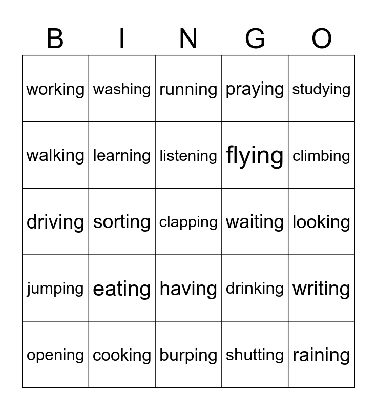 This bingo card has a free space and 24 words: eating, cooking, listening, opening, studying, working, walking, washing, waiting, having, flying, driving, drinking, writing, learning, shutting, looking, running, climbing, sorting, raining, jumping, praying and burping.