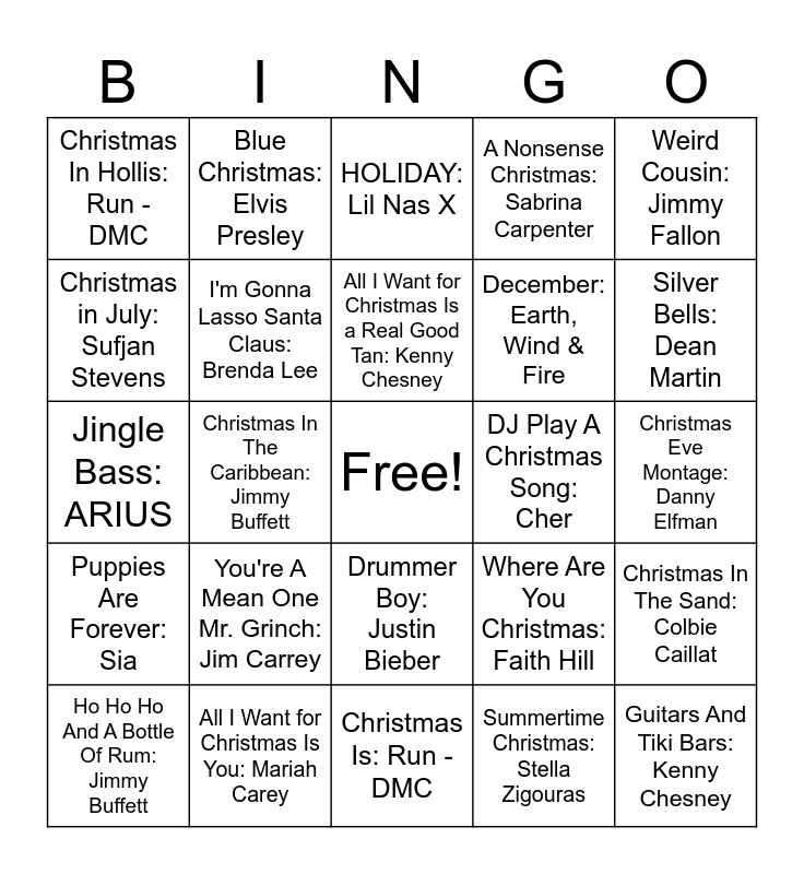 This bingo card has a free space and 45 words: Catch Myself Some Rays: Shaggy, Guitars And Tiki Bars: Kenny Chesney, Boat Drinks: Jimmy Buffett, Ho Ho Ho And A Bottle Of Rum: Jimmy Buffett, Christmas in June: AJR, Summertime Christmas: Stella Zigouras, HOLIDAY: Lil Nas X, Wet, Wet Christmas: SpongeBob, Weird Cousin: Jimmy Fallon, All I Want for Christmas Is You: Mariah Carey, A Nonsense Christmas: Sabrina Carpenter, DJ Play A Christmas Song: Cher, Drummer Boy: Justin Bieber, You're A Mean One Mr. Grinch: Jim Carrey, I Am the Grinch: Tyler, The Creator, Christmas Is: Run - DMC, What's This?: Danny Elfman, Jingle Bass: ARIUS, Last Christmas: Wham!, Silver Bells: Dean Martin, Blue Christmas: Elvis Presley, I'll Be Home For Christmas: Max McNown, Merry Christmas: Ed Sheeran, Christmas In Hollis: Run - DMC, Carol of the Bells: John Williams, Christmas Eve Montage: Danny Elfman, The Chipmunk Song: Alvin & The Chipmunks, Santa Clause Is Coming To Town: The Jackson 5, Where Are You Christmas: Faith Hill, Puppies Are Forever: Sia, Mele Kalikimaka: Hawaiian Waikiki Beach Entertainers, Christmas In The Sand: Colbie Caillat, Christmas Island: Ella Fitzgerald, Tropical Christmas: The Bellamy Brothers, Little Saint Nick: The Beach Boys, Christmas In The Caribbean: Jimmy Buffett, Hot Christmas: Squirrel Nut Zippers, Surfin' Santa: Lord Douglas Byron, Mambo Santa Mambo: The Enchanters, All I Want for Christmas Is a Real Good Tan: Kenny Chesney, Christmas in July: Sufjan Stevens, December: Earth, Wind & Fire, I'm Getting A Ukulele For Christmas: Carly Jamison, I'm Gonna Lasso Santa Claus: Brenda Lee and No Icy Christmas: Shaggy.