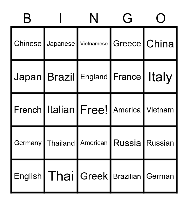 This bingo card has a free space and 24 words: Thailand, Thai, England, English, China, Chinese, Japan, Japanese, America, American, France, French, Russia, Russian, Brazil, Brazilian, Vietnam, Vietnamese, Italy, Italian, German, Germany, Greece and Greek.