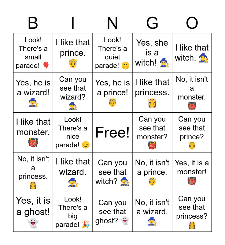 This bingo card has a free space and 30 words: Look! There's a big parade! 🎉, Look! There's a fun parade! 🎊, Look! There's a nice parade! 😊, Look! There's a cute parade! 🐣, Look! There's a small parade! 🎈, Look! There's a quiet parade! 🤫, Can you see that wizard? 🧙, Can you see that witch? 🧙♀️, Can you see that monster? 👹, Can you see that ghost? 👻, Can you see that prince? 🤴, Can you see that princess? 👸, No, it isn't a wizard. 🧙, No, it isn't a witch. 🧙♀️, No, it isn't a monster. 👹, No, it isn't a ghost. 👻, No, it isn't a prince. 🤴, No, it isn't a princess. 👸, I like that wizard. 🧙, I like that witch. 🧙♀️, I like that monster. 👹, I like that ghost. 👻, I like that prince. 🤴, I like that princess. 👸, Yes, he is a wizard! 🧙, Yes, she is a witch! 🧙♀️, Yes, it is a monster! 👹, Yes, it is a ghost! 👻, Yes, he is a prince! 🤴 and Yes, she is a princess! 👸.