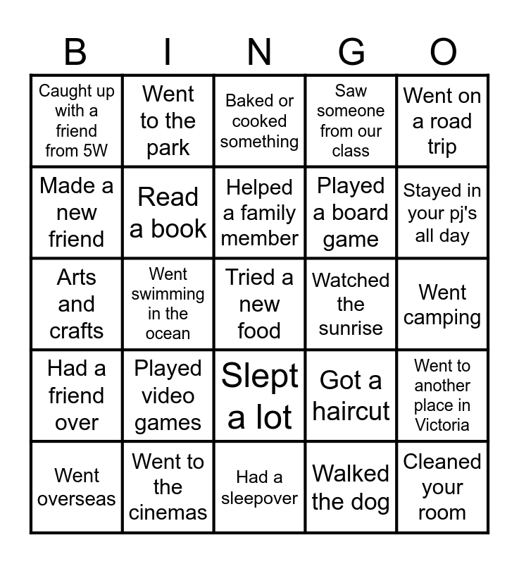 This bingo card has a free space and 29 words: Went overseas, Went to another city in Australia, Went swimming in the ocean, Went skiing or snowboarding, Caught up with a friend from 5W, Baked or cooked something, Read a book, Played video games, Watched the sunrise, Went to the cinemas, Went camping, Cleaned your room, Had a sleepover, Walked the dog, Stayed in your pj's all day, Saw whales or dolphins, Slept a lot, Had a friend over, Went on a road trip, Arts and crafts, Got a haircut, Hurt themselves, Played a board game, Made a new friend, Saw someone from our class, Went to the park, Went to another place in Victoria, Helped a family member and Went swimming.