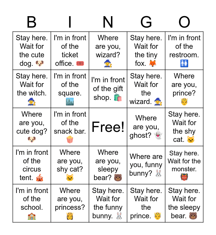 This bingo card has a free space and 33 words: I'm in front of the clock tower. π°οΈ, I'm in front of the fountain. β², I'm in front of the snack bar. πΏ, I'm in front of the ticket office. ποΈ, I'm in front of the circus tent. πͺ, I'm in front of the square. ποΈ, I'm in front of the restroom. π», I'm in front of the school. π«, I'm in front of the ticket office. ποΈ, I'm in front of the ice cream shop. π¦, I'm in front of the gift shop. ποΈ, Where are you, wizard? π§, Where are you, witch? π§ββοΈ, Where are you, monster? πΉ, Where are you, ghost? π», Where are you, prince? π€΄, Where are you, princess? πΈ, Where are you, cute dog? πΆ, Where are you, shy cat? π±, Where are you, funny bunny? π°, Where are you, sleepy bear? π», Where are you, tiny fox? π¦, Stay here. Wait for the cute dog. πΆ, Stay here. Wait for the shy cat. π±, Stay here. Wait for the funny bunny. π°, Stay here. Wait for the sleepy bear. π», Stay here. Wait for the tiny fox. π¦, Stay here. Wait for the wizard. π§, Stay here. Wait for the witch. π§ββοΈ, Stay here. Wait for the monster. πΉ, Stay here. Wait for the ghost. π», Stay here. Wait for the prince. π€΄ and Stay here. Wait for the princess. πΈ.