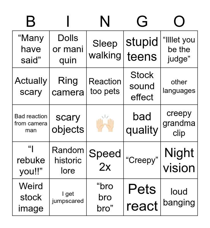This bingo card has a free space and 24 words: Random historic lore, I get jumpscared, Reaction too pets, Weird stock image, “Illlet you be the judge”, “Many have said”, Actually scary, Dolls or mani quin, bad quality, Speed 2x, Stock sound effect, Bad reaction from camera man, “Creepy”, Night vision, Ring camera, Pets react, creepy grandma clip, Sleep walking, other languages, scary objects, loud banging, “I rebuke you!!”, stupid teens and “bro bro bro”.