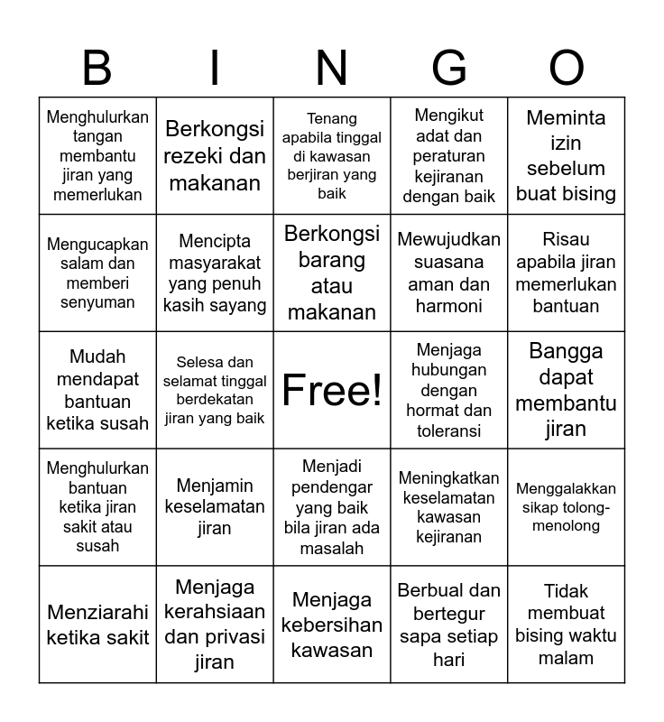 This bingo card has a free space and 25 words: Menjamin keselamatan jiran, Menjaga kebersihan kawasan, Berkongsi barang atau makanan, Menziarahi ketika sakit, Meminta izin sebelum buat bising, Menghulurkan tangan membantu jiran yang memerlukan, Mengucapkan salam dan memberi senyuman, Berkongsi rezeki dan makanan, Menjaga hubungan dengan hormat dan toleransi, Menjadi pendengar yang baik bila jiran ada masalah, Mewujudkan suasana aman dan harmoni, Mudah mendapat bantuan ketika susah, Meningkatkan keselamatan kawasan kejiranan, Menggalakkan sikap tolong-menolong, Mencipta masyarakat yang penuh kasih sayang, Gembira kerana ada jiran yang prihatin, Bangga dapat membantu jiran, Tenang apabila tinggal di kawasan berjiran yang baik, Risau apabila jiran memerlukan bantuan, Selesa dan selamat tinggal berdekatan jiran yang baik, Tidak membuat bising waktu malam, Menjaga kerahsiaan dan privasi jiran, Menghulurkan bantuan ketika jiran sakit atau susah, Mengikut adat dan peraturan kejiranan dengan baik and Berbual dan bertegur sapa setiap hari.