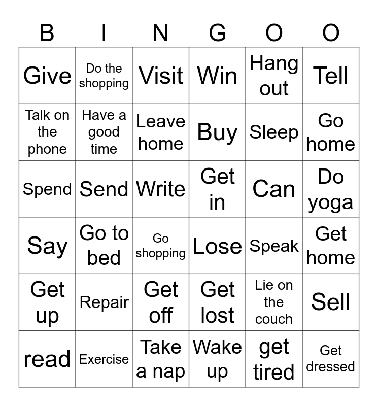 This bingo card has 36 words: Get lost, Get off, Wake up, Talk on the phone, Say, Get in, Have a good time, Take a nap, Hang out, Lie on the couch, Go home, Win, Sell, Send, Buy, Give, Get up, Can, Spend, Visit, Write, Go to bed, Lose, Go shopping, Speak, Do the shopping, Sleep, Exercise, Leave home, Tell, Get dressed, read, Get home, Do yoga, Repair and get tired.