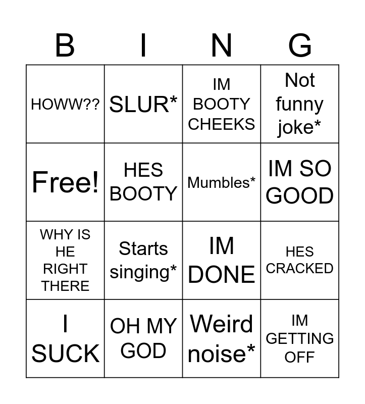 This bingo card has 16 words: OH MY GOD, HES CRACKED, IM BOOTY CHEEKS, HOWW??, WHY IS HE RIGHT THERE, SLUR*, IM DONE, Weird noise*, Free!, HES BOOTY, I SUCK, Not funny joke*, Starts singing*, IM SO GOOD, Mumbles* and IM GETTING OFF.
