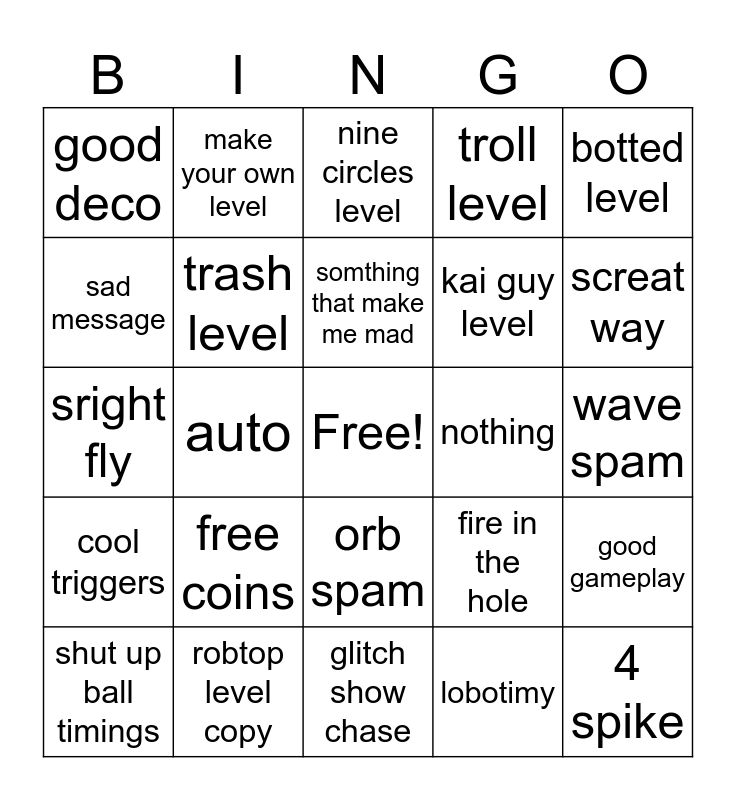 This bingo card has a free space and 24 words: free coins, robtop level copy, somthing that make me mad, shut up ball timings, botted level, good deco, sad message, make your own level, nothing, orb spam, kai guy level, sright fly, fire in the hole, good gameplay, trash level, lobotimy, wave spam, nine circles level, screat way, auto, 4 spike, cool triggers, troll level and glitch show chase.