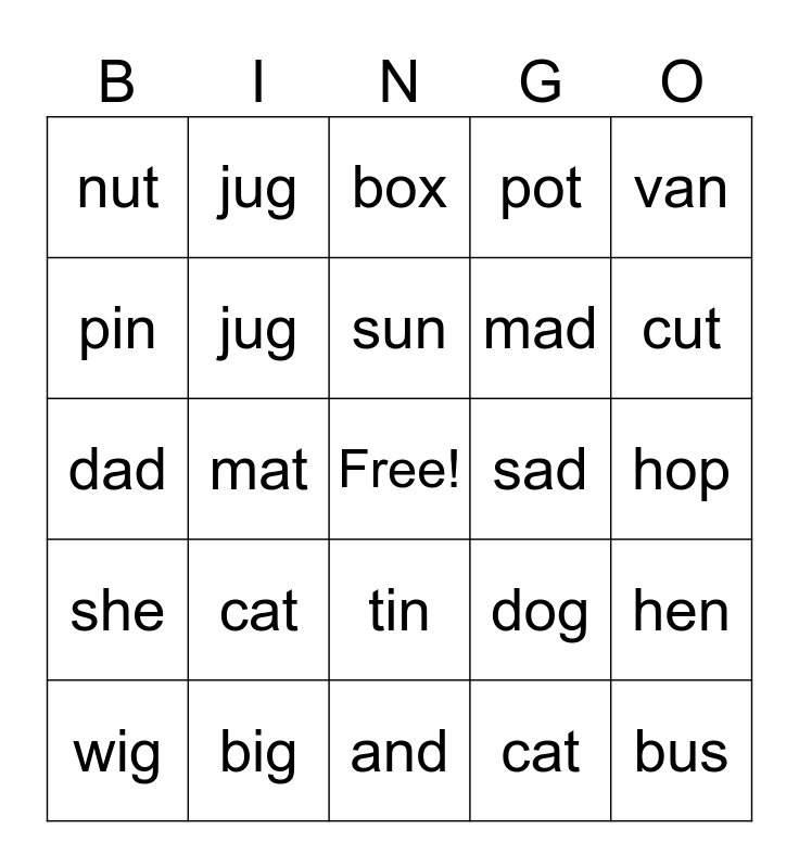 This bingo card has a free space and 25 words: cat, and, sun, wig, van, nut, pin, jug, sad, tin, mad, dad, dog, hen, jug, sit, hop, box, cut, mat, bus, big, she, pot and cat.