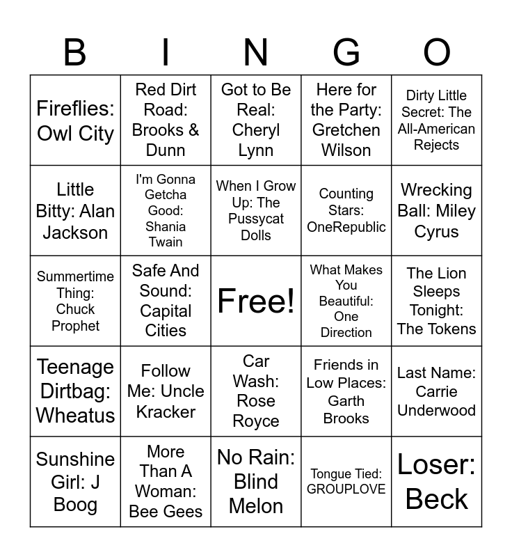 This bingo card has a free space and 50 words: Californication: Red Hot Chili Peppers, Loser: Beck, Learn to Fly: Foo Fighters, No Rain: Blind Melon, Follow Me: Uncle Kracker, Should've Been A Cowboy: Toby Keith, Red Dirt Road: Brooks & Dunn, Red Solo Cup: Toby Keith, Little Bitty: Alan Jackson, Where The Green Grass Grows: Tim McGraw, I'm Gonna Getcha Good: Shania Twain, Here for the Party: Gretchen Wilson, Last Name: Carrie Underwood, Friends in Low Places: Garth Brooks, Chattahoochee: Alan Jackson, Raise Your Glass: P!nk, When I Grow Up: The Pussycat Dolls, What Makes You Beautiful: One Direction, Clumsy: Fergie, Dirty Little Secret: The All-American Rejects, Safe And Sound: Capital Cities, Tongue Tied: GROUPLOVE, Fireflies: Owl City, Counting Stars: OneRepublic, Don't Cha: The Pussycat Dolls, Pumped Up Kicks: Foster The People, Wrecking Ball: Miley Cyrus, 5 Years Time: Noah And The Whale, Got to Be Real: Cheryl Lynn, Car Wash: Rose Royce, Jessie's Girl: Rick Springfield, Escape (The Pina Colada Song): Rupert Holmes, Hooked On A Feeling: Blue Swede, Jamming: Bob Marley & The Wailers, More Than A Woman: Bee Gees, Down Under: Men At Work, Country Road: Toots & The Maytals, Fun, Fun, Fun: The Beach Boys, Walking On Sunshine: Katrina & The Waves, The Lion Sleeps Tonight: The Tokens, Come A Little Bit Closer: Jay & The Americans, Afternoon Delight: Starland Vocal Band, The Twist: Chubby Checker, When the Sun Goes Down: Kenny Chesney, Sunshine Girl: J Boog, Summertime Thing: Chuck Prophet, Summertime: Orville Peck, Every Morning: Sugar Ray, Teenage Dirtbag: Wheatus and Come As You Are: Nirvana.