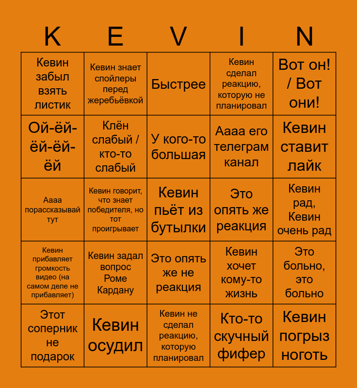 This bingo card has a free space and 24 words: Кевин задал вопрос Роме Кардану, Кевин осудил, У кого-то большая, Этот соперник не подарок, Вот он! / Вот они!, Кевин забыл взять листик, Ой-ёй-ёй-ёй-ёй, Кевин знает спойлеры перед жеребьёвкой, Это опять же реакция, Это опять же не реакция, Аааа его телеграм канал, Аааа порассказывай тут, Кевин хочет кому-то жизнь, Это больно, это больно, Клён слабый / кто-то слабый, Кто-то скучный фифер, Кевин рад, Кевин очень рад, Быстрее, Кевин ставит лайк, Кевин говорит, что знает победителя, но тот проигрывает, Кевин погрыз ноготь, Кевин прибавляет громкость видео (на самом деле не прибавляет), Кевин сделал реакцию, которую не планировал and Кевин не сделал реакцию, которую планировал.