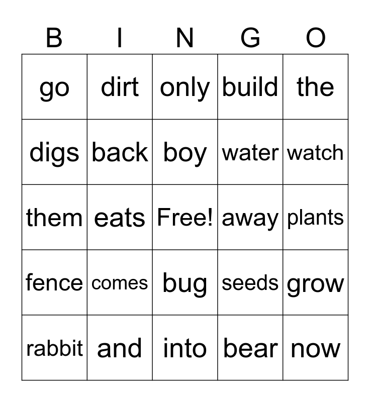 This bingo card has a free space and 26 words: bug, bear, boy, and, the, go, digs, dirt, plants, seeds, water, them, grow, rabbit, eats, chases, build, fence, only, now, watch, into, away, comes, back and but.