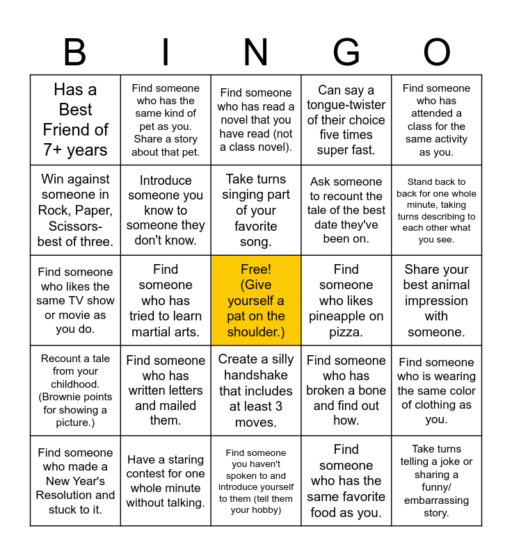 This bingo card has a free space and 26 words: Create a silly handshake that includes at least 3 moves., Find someone who has the same favorite food as you., Take turns singing part of your favorite song., Have a staring contest for one whole minute without talking., Find someone who has attended a class for the same activity as you., Has a Best Friend of 7+ years, Win against someone in Rock, Paper, Scissors- best of three., Find someone who has the same kind of pet as you. Share a story about that pet., Share your best animal impression with someone., Find someone who has broken a bone and find out how., Ask someone to recount the tale of the best date they've been on., Find someone who likes the same TV show or movie as you do., Find someone who is wearing the same color of clothing as you., Find someone who made a New Year's Resolution and stuck to it., Find someone who has tried to learn martial arts., Shake hands the proper way with another person., Can say a tongue-twister of their choice five times super fast., Recount a tale from your childhood. (Brownie points for showing a picture.), Find someone who has read a novel that you have read (not a class novel)., Take turns telling a joke or sharing a funny/ embarrassing story., Stand back to back for one whole minute, taking turns describing to each other what you see., Find someone you haven't spoken to and introduce yourself to them (tell them your hobby), Find someone who likes pineapple on pizza., Find someone who has written letters and mailed them., Introduce someone you know to someone they don't know. and Share a story about your summer..