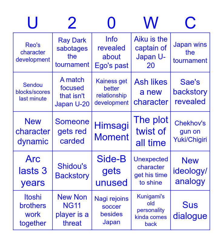 This bingo card has a free space and 24 words: Shidou's Backstory, New Non NG11 player is a threat, Kainess get better relationship development, Itoshi brothers work together, Japan wins the tournament, Reo's character development, Sendou blocks/scores last minute, Ray Dark sabotages the tournament, The plot twist of all time, Side-B gets unused, Ash likes a new character, New character dynamic, Unexpected character get his time to shine, New ideology/ analogy, A match focused that isn't Japan U-20, Kunigami's old personality kinda comes back, Chekhov's gun on Yuki/Chigiri, Info revealed about Ego's past, Sae's backstory revealed, Someone gets red carded, Sus dialogue, Arc lasts 3 years, Aiku is the captain of Japan U-20 and Nagi rejoins soccer besides Japan.