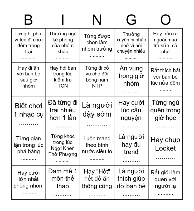 This bingo card has 25 words: Từng khóc trong lúc Ngợi Khen Thờ Phượng .........., Hay "Hốt" hết đồ ăn thông công .........., Từng đi cổ vũ cho đội bóng nam NTP .........., Hay cười lớn nhất phòng nhóm .........., Hay trốn ra ngoài mua trà sữa, cà phê .........., Từng bị phạt vì lén đi chơi đêm trong trại .........., Hay đi ăn với bạn bè sau giờ nhóm .........., Thường ngủ ké phòng của nhóm khác .........., Hay cười lúc cầu nguyện .........., Luôn mang theo bình nước siêu to .........., Ăn vụng trong giờ nhóm .........., Biết chơi 1 nhạc cụ .........., Là người hay đu trend .........., Hay chụp Locket .........., Hay hỏi bạn trong lúc kiểm tra TCN .........., Rất giỏi làm quen với người lạ .........., Từng ngủ quên trong giờ học .........., Từng được chọn làm nhóm trưởng .........., Rất thích hát với bạn bè lúc nửa đêm .........., Đã từng đi trại nhiều hơn 1 lần .........., Là người dậy sớm .........., Đam mê 1 môn thể thao .........., Từng gian lận trong lúc phá băng .........., Thường xuyên bị nhắc nhở vì nói chuyện nhiều .......... and Là người thích giúp đỡ bạn bè ...........