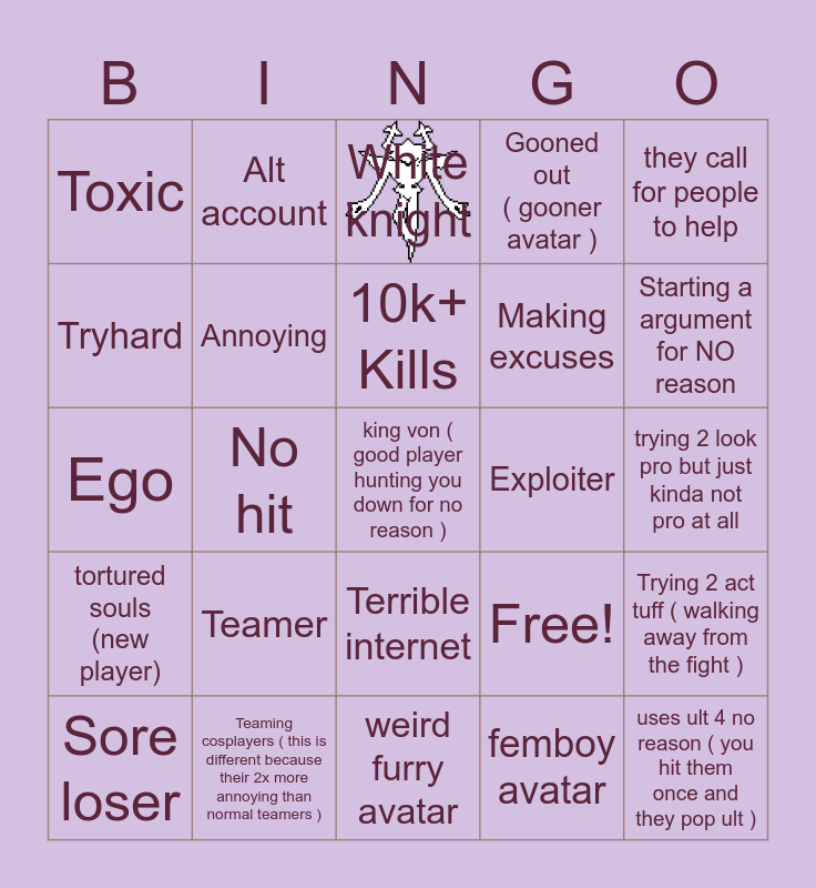 This bingo card has 1 images and 25 words: Teamer, weird furry avatar, 10k+ Kills, Sore loser, they call for people to help, Toxic, Tryhard, Alt account, Exploiter, Terrible internet, Making excuses, Ego, Free!, Trying 2 act tuff ( walking away from the fight ), Annoying, uses ult 4 no reason ( you hit them once and they pop ult ), trying 2 look pro but just kinda not pro at all, White knight, Starting a argument for NO reason, No hit, king von ( good player hunting you down for no reason ), Teaming cosplayers ( this is different because their 2x more annoying than normal teamers ), tortured souls (new player), Gooned out ( gooner avatar ) and femboy avatar.