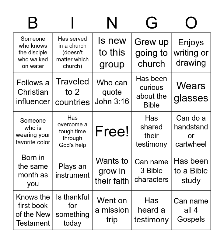 This bingo card has a free space and 24 words: Plays an instrument, Is thankful for something today, Who can quote John 3:16, Knows the first book of the New Testament, Enjoys writing or drawing, Someone who knows the disciple who walked on water, Follows a Christian influencer, Has served in a church (doesn't matter which church), Has shared their testimony, Wants to grow in their faith, Has been curious about the Bible, Someone who is wearing your favorite color, Can name 3 Bible characters, Has been to a Bible study, Traveled to 2 countries, Has heard a testimony, Can do a handstand or cartwheel, Is new to this group, Wears glasses, Has overcome a tough time through God's help, Can name all 4 Gospels, Born in the same month as you, Grew up going to church and Went on a mission trip.