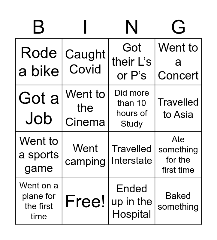 This bingo card has 21 words: Free!, Travelled to Europe, Caught Covid, Went Skiing, Ended up in the Hospital, Did more than 10 hours of Study, Rode a bike, Got their L’s or P’s, Travelled Interstate, Travelled to Asia, Went to a sports game, Went to a Concert, Baked something, Went surfing, Went to the Cinema, Got a new piercing, Went on a plane for the first time, Went camping, Got a Job, Ate something for the first time and Slept past midday in the holidays.