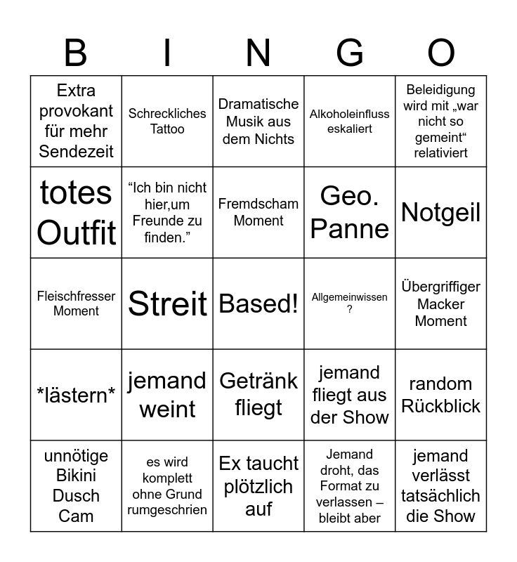This bingo card has a free space and 24 words: jemand weint, es wird komplett ohne Grund rumgeschrien, Fremdscham Moment, unnötige Bikini Dusch Cam, Beleidigung wird mit „war nicht so gemeint“ relativiert, Extra provokant für mehr Sendezeit, totes Outfit, Schreckliches Tattoo, Allgemeinwissen ?, Getränk fliegt, Geo. Panne, Fleischfresser Moment, jemand fliegt aus der Show, random Rückblick, “Ich bin nicht hier,um Freunde zu finden.”, Jemand droht, das Format zu verlassen – bleibt aber, Übergriffiger Macker Moment, Dramatische Musik aus dem Nichts, Notgeil, Streit, jemand verlässt tatsächlich die Show, *lästern*, Alkoholeinfluss eskaliert and Ex taucht plötzlich auf.