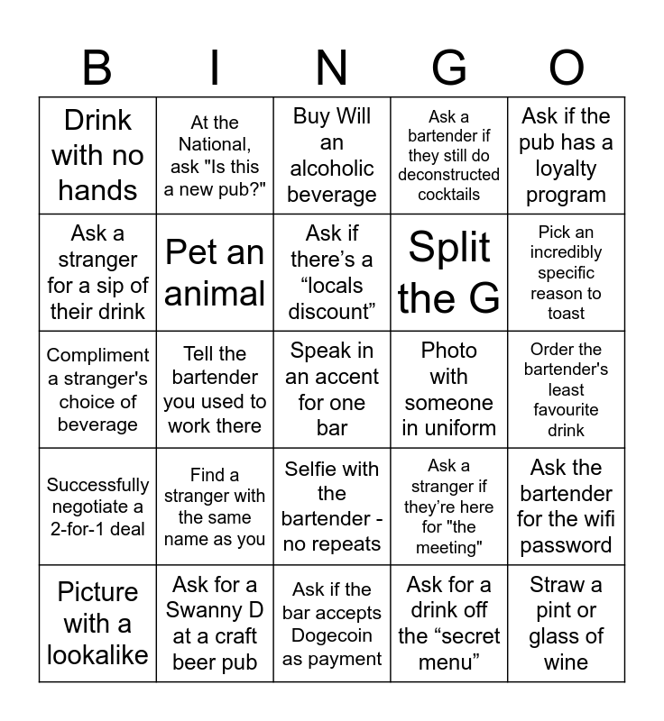 This bingo card has 25 words: Find a stranger with the same name as you, Ask if the bar accepts Dogecoin as payment, Ask if there’s a “locals discount”, Picture with a lookalike, Ask if the pub has a loyalty program, Drink with no hands, Ask a stranger for a sip of their drink, At the National, ask "Is this a new pub?", Photo with someone in uniform, Selfie with the bartender - no repeats, Split the G, Compliment a stranger's choice of beverage, Ask a stranger if they’re here for "the meeting", Ask the bartender for the wifi password, Pet an animal, Straw a pint or glass of wine, Order the bartender's least favourite drink, Buy Will an alcoholic beverage, Pick an incredibly specific reason to toast, Tell the bartender you used to work there, Speak in an accent for one bar, Ask for a Swanny D at a craft beer pub, Successfully negotiate a 2-for-1 deal, Ask a bartender if they still do deconstructed cocktails and Ask for a drink off the “secret menu”.