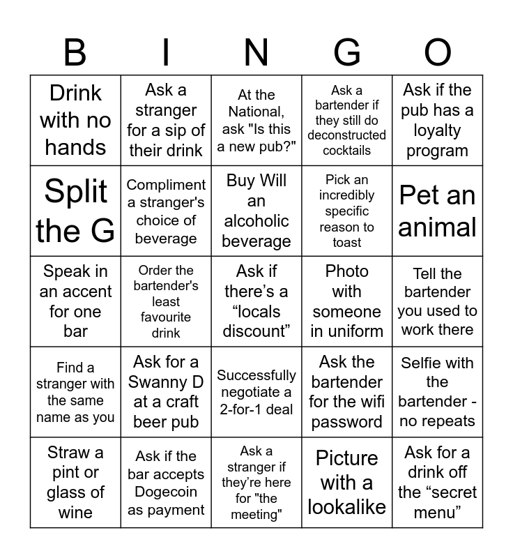 This bingo card has 25 words: Find a stranger with the same name as you, Ask if the bar accepts Dogecoin as payment, Ask if there’s a “locals discount”, Picture with a lookalike, Ask if the pub has a loyalty program, Drink with no hands, Ask a stranger for a sip of their drink, At the National, ask "Is this a new pub?", Photo with someone in uniform, Selfie with the bartender - no repeats, Split the G, Compliment a stranger's choice of beverage, Ask a stranger if they’re here for "the meeting", Ask the bartender for the wifi password, Pet an animal, Straw a pint or glass of wine, Order the bartender's least favourite drink, Buy Will an alcoholic beverage, Pick an incredibly specific reason to toast, Tell the bartender you used to work there, Speak in an accent for one bar, Ask for a Swanny D at a craft beer pub, Successfully negotiate a 2-for-1 deal, Ask a bartender if they still do deconstructed cocktails and Ask for a drink off the “secret menu”.