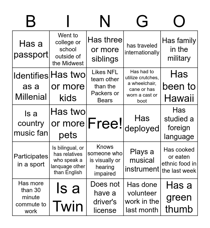 This bingo card has a free space and 24 words: Is bilingual, or has relatives who speak a lanquage other than English, Is a Twin, Likes NFL team other than the Packers or Bears, Has more than 30 minute commute to work, Has family in the military, Has a passport, Identifies as a Millenial, Went to college or school outside of the Midwest, Has deployed, Knows someone who is visually or hearing impaired, Has had to utilize crutches, a wheelchair, cane or has worn a cast or boot, Is a country music fan, Plays a musical instrument, Has cooked or eaten ethnic food in the last week, Has two or more kids, Has done volunteer work in the last month, Has studied a foreign language, Has three or more siblings, Has been to Hawaii, Has two or more pets, Has a green thumb, Participates in a sport, has traveled internationally and Does not have a driver's license.