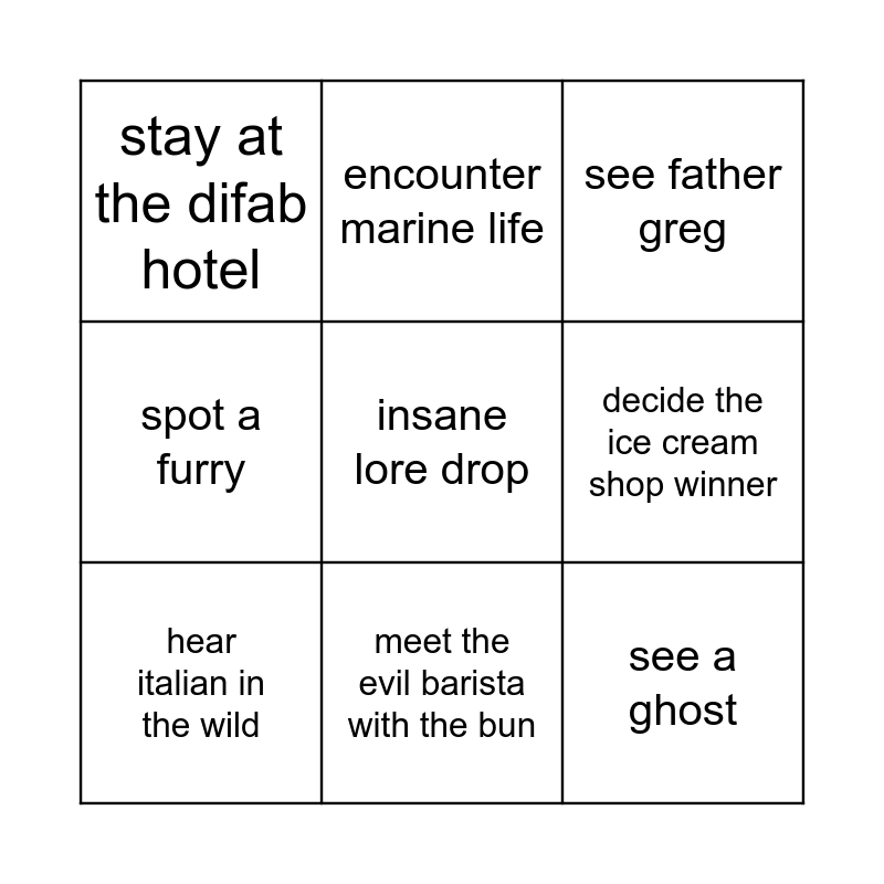 This bingo card has 9 words: hear italian in the wild, see father greg, encounter marine life, spot a furry, stay at the difab hotel, decide the ice cream shop winner, insane lore drop, see a ghost and meet the evil barista with the bun.